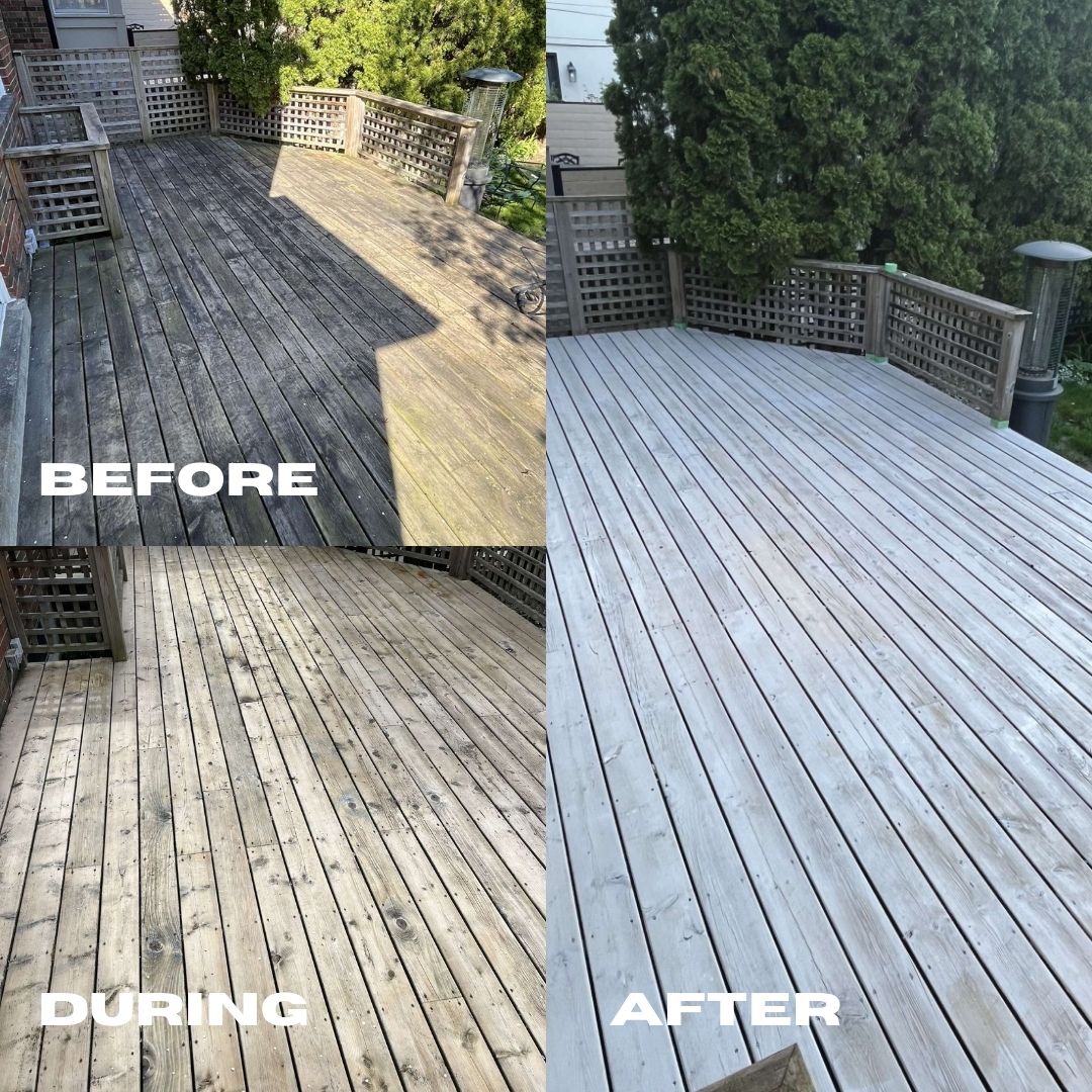 Leaside- It was time to say bye to years of built-up grime for this homeowner. Getting the layers off took several passes but finally we got that deck to shine!